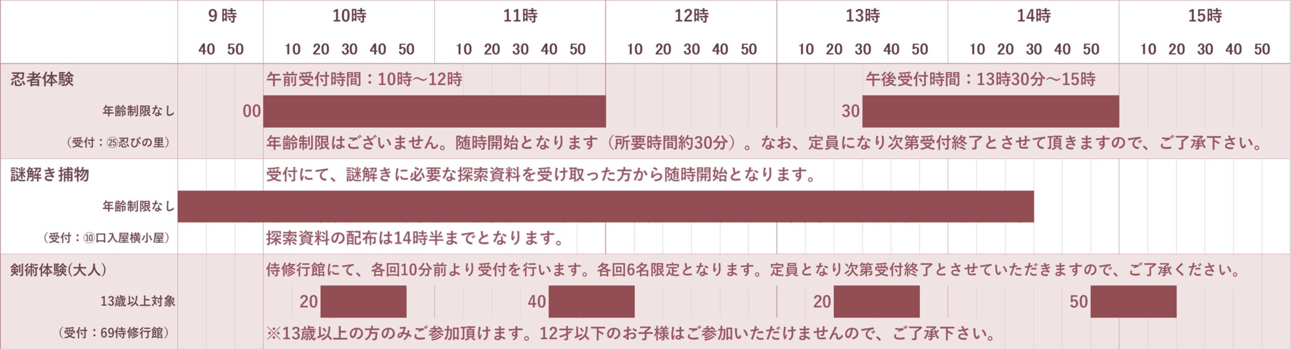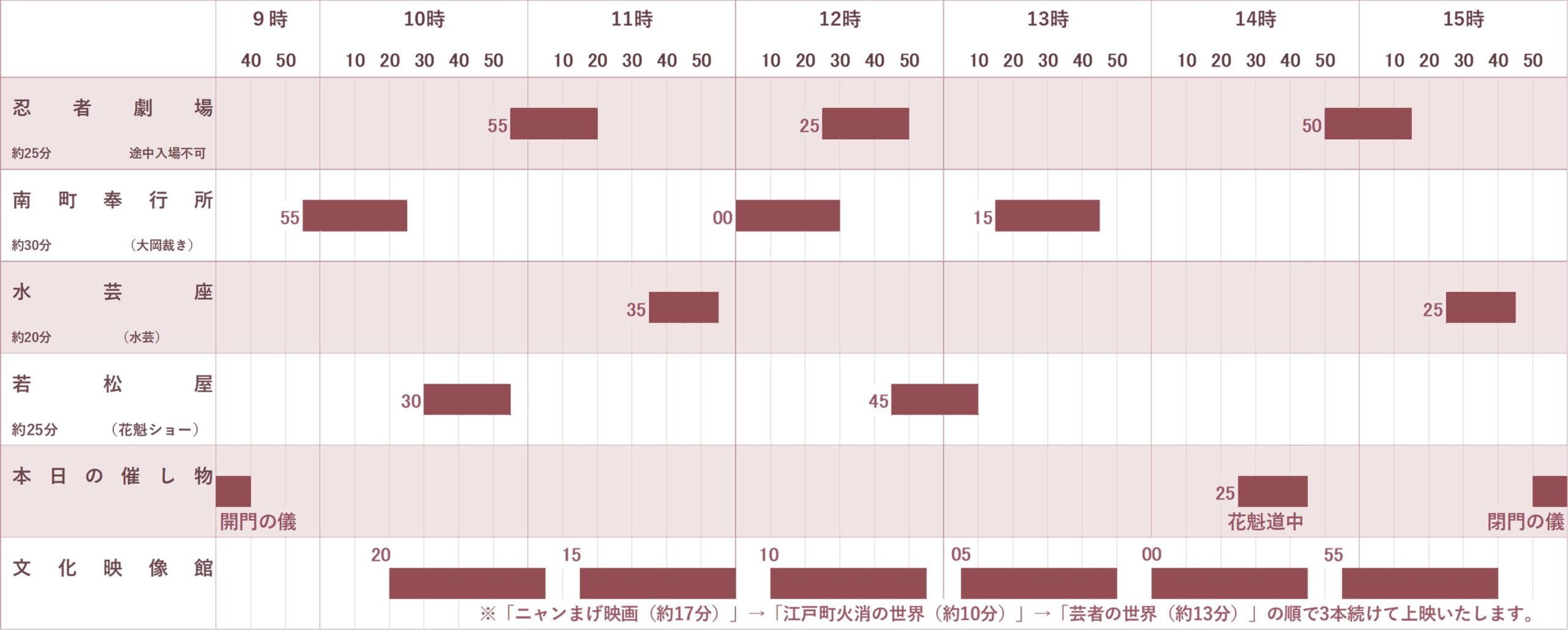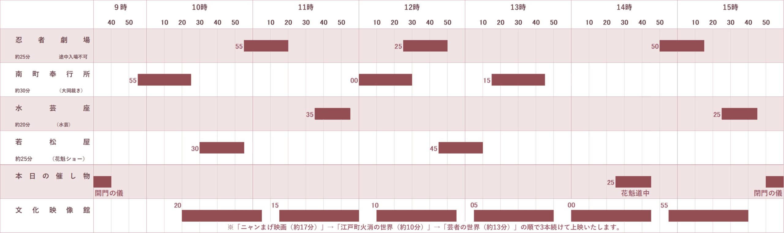 - 時刻表の帯部分が劇場の上演時間です。